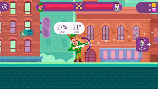 游戏的画面表现还算不错,在操作上则采用了经典的弹射方式,有些类似《愤怒的小鸟》一样,玩家们随意按住屏幕主角周围区域,然后向后拖动手指即可出现反弹能量值以及角度值,当玩家们放开手指的时候,手中的武器就会直接射出去了。本作操作起来很简单,而且还为玩家们标注好了能量和角度,这都便于玩家们更好的控制自己的射击准确度。
