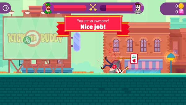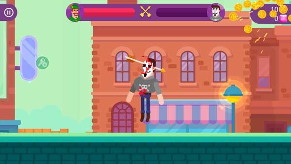 游戏中挑战过程非常有趣,玩家们与对手会进行回合对战,由于不知道对手的站位,所以一般第一次都不能攻击到的,需要玩家们通过多次尝试来挑战力度和角度,对于高手玩家来说,或许第二次就能攻击到了,而对于新手而言需要尝试很多次才能找到感觉。游戏的挑战过程可以说是惊险刺激,特别是在画面上的表现更加夸张,人物被武器射到之后会有各种穿插效果,甚至会看到肌肉、骨骼、内脏等,而且还会有血液喷溅效果,十分的血腥,所以对于小玩家们来说并不太合适。