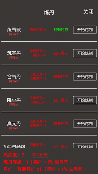 4、进入【炼丹】界面,可以炼制练气散、筑基丹、合气丹、降尘丹、真元丹等各种各样的仙丹,