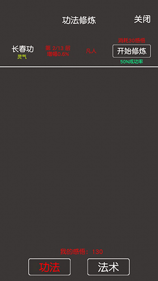 5、进入【功法】界面,可以修炼不同的功法和法术,