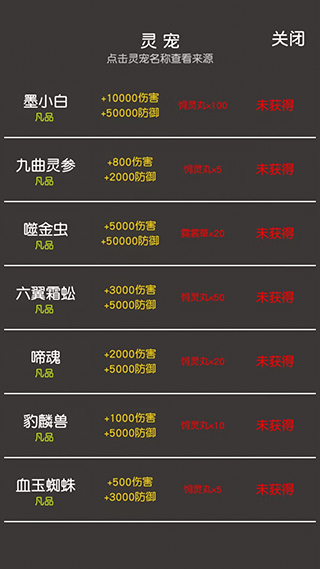 7、进入【灵宠】界面,可以获得墨小白、噬金虫、豹麟兽等灵宠,