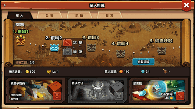 三大模式--领主争霸赛、资源掠夺战,单人闯关战,不同的模式带给你不同的体验!