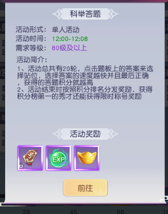 每天12点-12点08分开启,回答各种有趣的问题获得经验和元宝奖励,第一名还能会的专属称号奖励;