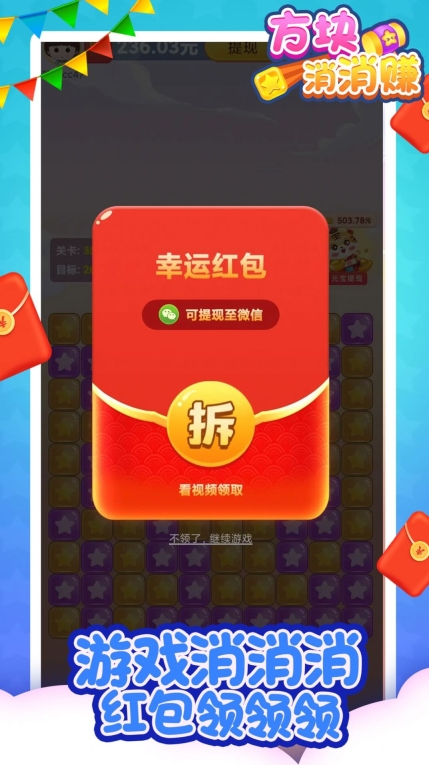 方块消消赚红包版,这可是当下超火的消除闯关游戏。它不仅操作简便,消除过程更是趣味十足。重点是,游戏内红包福利多多,每位玩家都有机会领取。整个游戏流程难度不大,快来展现你卓越的水平,在线畅快闯关吧!