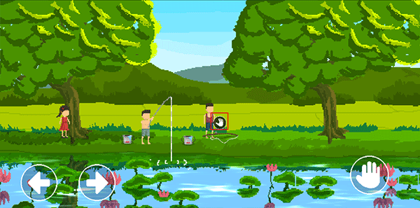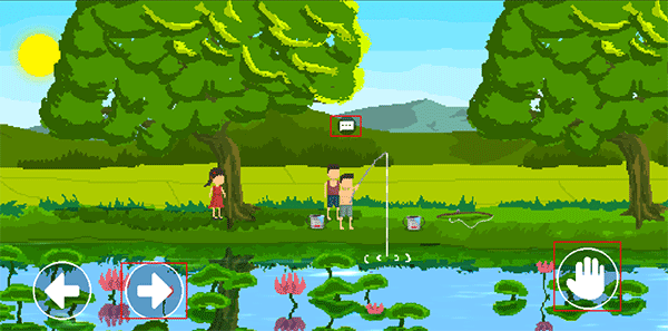 2、选择帮大宇钓鱼,接着继续朝右移动至鱼竿位置,当鱼竿上方出现对话图标时,点击右下角的手印,随即开始钓鱼。