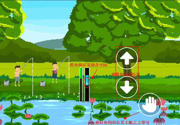 3、开启钓鱼小游戏后,可把鱼钩置于中间位置,接着静静等待方块移动至相应位置,玩家只需持续点击右下角按钮来增加钓鱼值。钓到三条鱼后,再去和大宇对话,随后三人便开始玩木头人游戏。