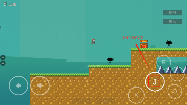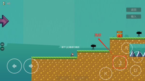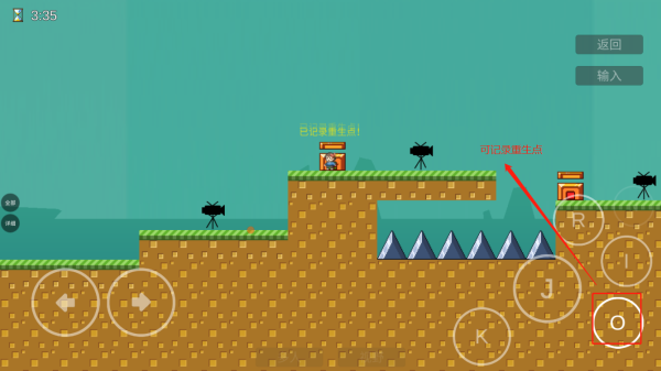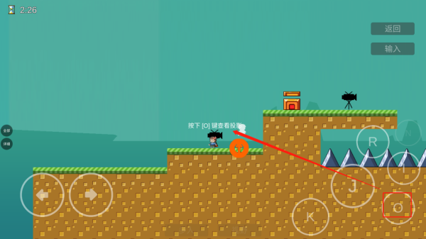 4、点击J可进行跳跃,长按可以跳的更高,点击o可查看投影,也可以在“门”的位置点击进行记录重生点