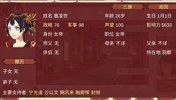 让二代受苦的根源,基本是权臣的影响力及声望,这两个数值是息息相关且相互加成的,如果权臣的二类数值高过女帝,就会导致女帝指令无人执行。