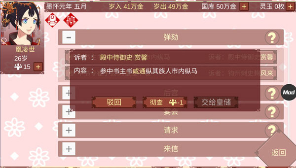 斥责会增加弹劾的概率,勤快一点斥责可以有效加快游戏进程,而彻查如若成功,你想要处理的人就会因为你的降责而跌去大量的声望和影响力。