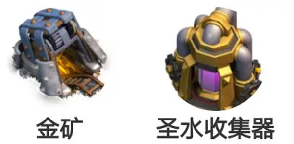 ·圣水:攻击资源,可透过圣水收集器收集,储存在圣水瓶中和大本营中,主要用于研究科技,升级9级及以上城墙,和非防御建筑及训练圣水兵种